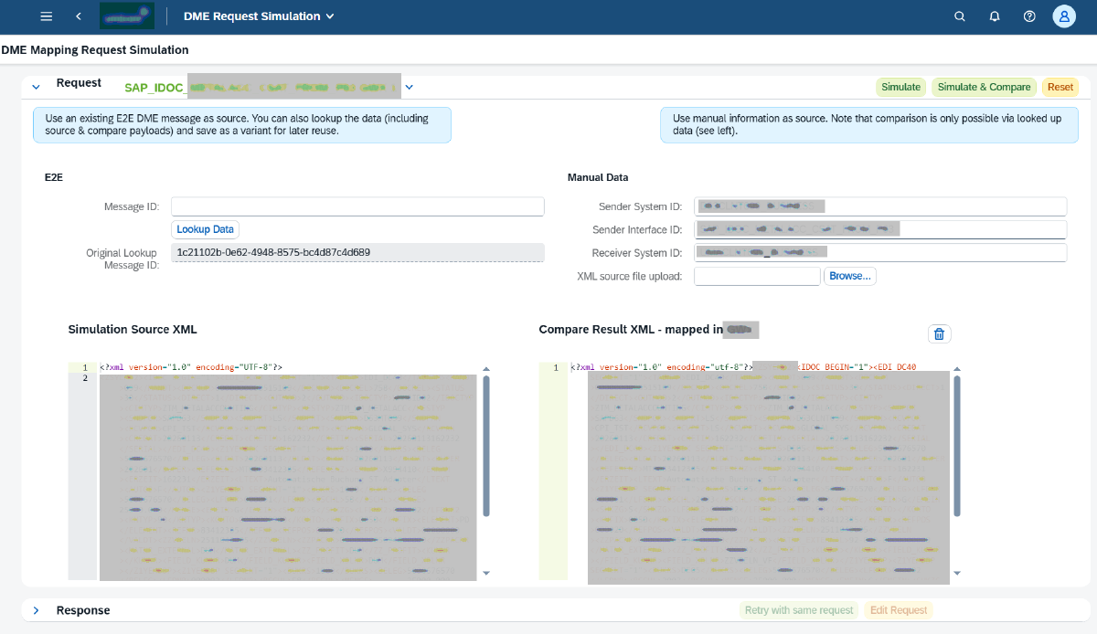 - DME Requests Simulator — custom Fiori app to simulate and compare Data Mapping Engine requests. Allows testing of mapping results against a given XML input, making it easy to identify the impact of configuration or XML content changes. Results can be compared against previously stored outputs, with color-coded visual highlighting of differences between the two result XML messages. Includes detailed tracing showing which mapping rules, mapping entities and mapping attributes were applied during resolution.