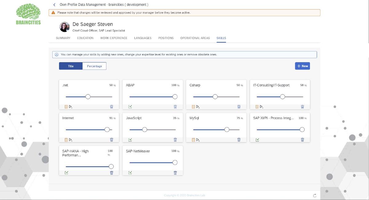 - Employee own profile management including skills, training, analysis of CV, etc